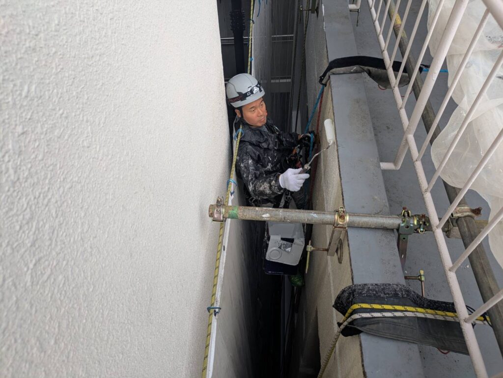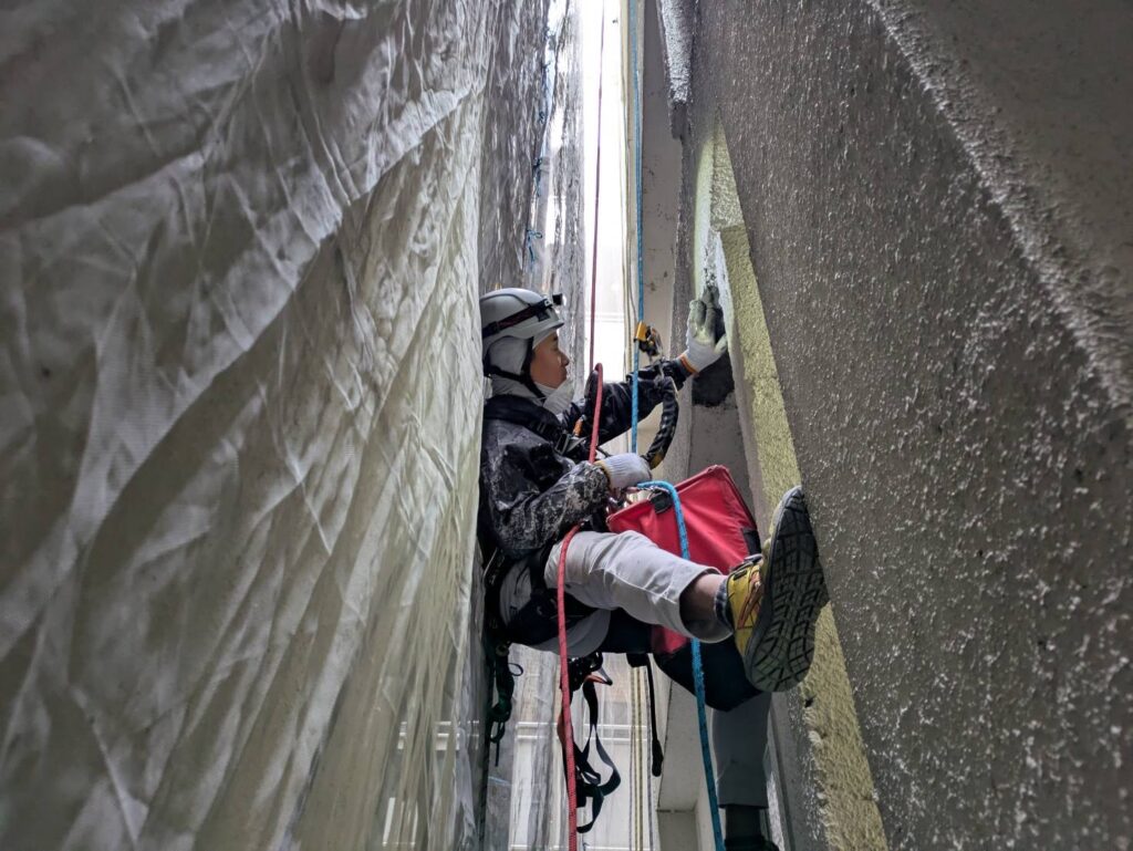 ロープアクセスでの塗装 2025/11/13 今回はロープアクセスでの塗装工事になります 都心のマンションは建物と建物の間が 狭いため足場が掛けられず長年の劣化で 建物躯体が傷んできていました ロープアクセスでは人が入れるスペースが有れば施工可能となるため隅々まで 修繕する事が可能となります