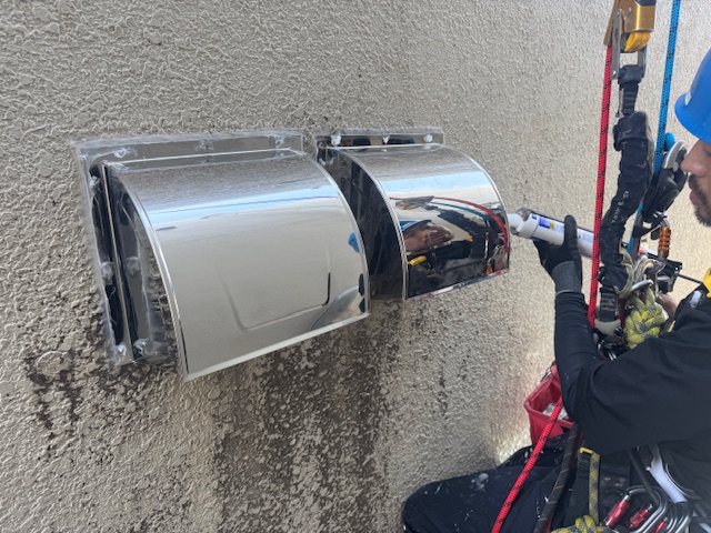 世田谷区のマンションで雨が降ると漏水するとのご相談を受けて調査した所 外部の通気口から雨水が入ってきておりました 対応作として通気口のうえに換気カバーを被せる事になりました 通常ですとこのような工事でも足場が必要となり費用が嵩んできます ロープアクセスなら予算を抑えてすぐに 漏水を止める処置を行える為 緊急で素早く対応出来ます